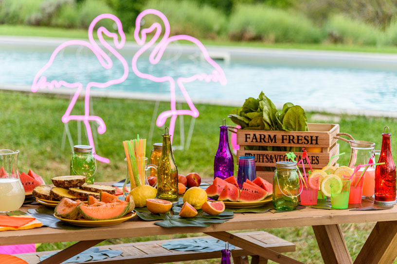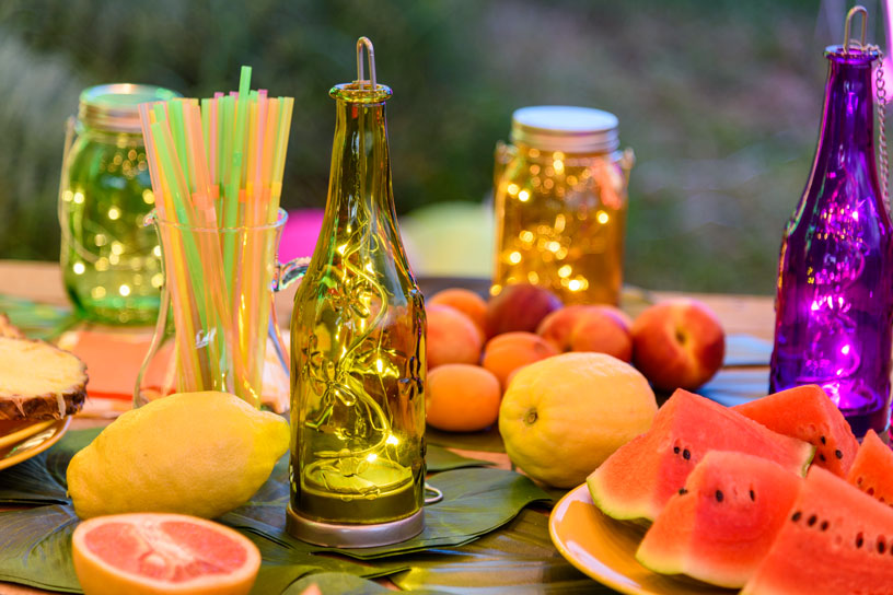 L'importante è che ci siano le palme, la frutta di stagione e i cocktail sotto gli ombrelloni di paglia. Per una volta possiamo fare a meno delle solite stuoie e collane hawaiane e dare un tocco di originalità alla nostra festa in piscina con le lucine decorative a led.