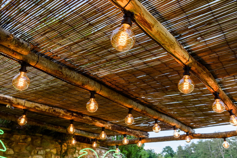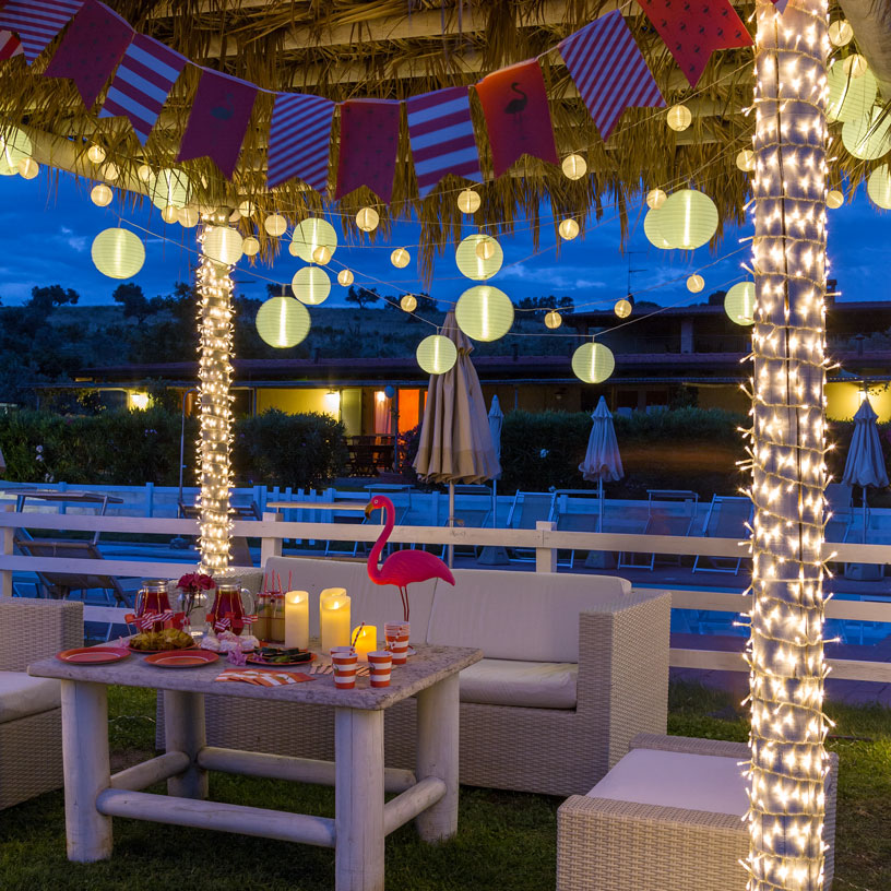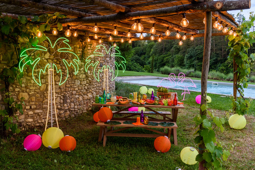 Ad una festa estiva all'aperto non possono mancare le luci decorative di catene led da esterno, lampadine vintage o lampade neon.