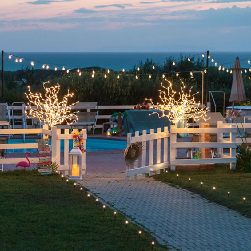 Se i colori sgargianti non ti vanno a genio e sogni un ambiente più raffinato, opta per luci calde, perfette per creare un'atmosfera intima e accogliente. Per decorare il giardino ricorri ad addobbi d'impatto ma funzionali: indica i vialetti con dei bastoncini luminosi e illumina l'ingresso della piscina con due grandi rami decorativi di luci led. I tuoi ospiti si sentiranno ben accolti, e sorpresi dall'originalità e dal buon gusto dell'allestimento.