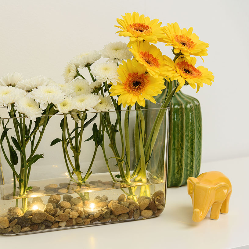 Prova a decorare un mobile del soggiorno con una composizione floreale in vaso trasparente, per un caloroso benvenuto a casa.