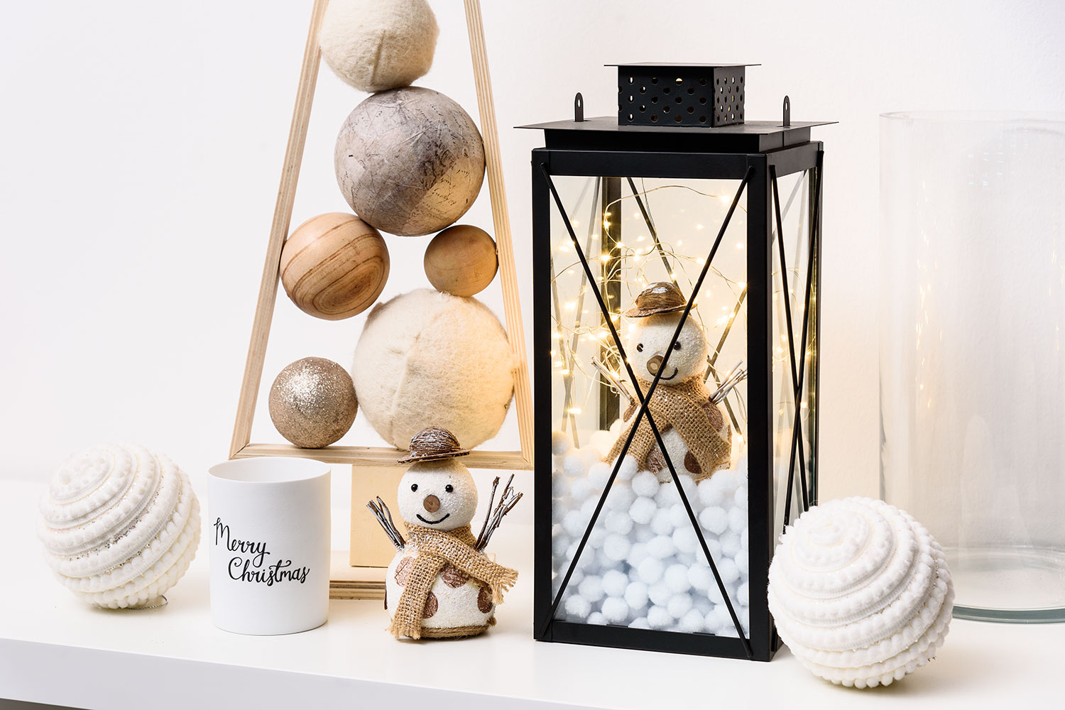 Ti suggeriamo una lanterna di design nera in metallo, abbastanza grande da poter ospitare un bel pupazzetto di neve, dei micro pon pon simili a fiocchi di neve. Porta la magia con una catena di micro led, il cavo è così sottile da scomparire tra i decori e far risaltare le lucine led della catena luminosa.