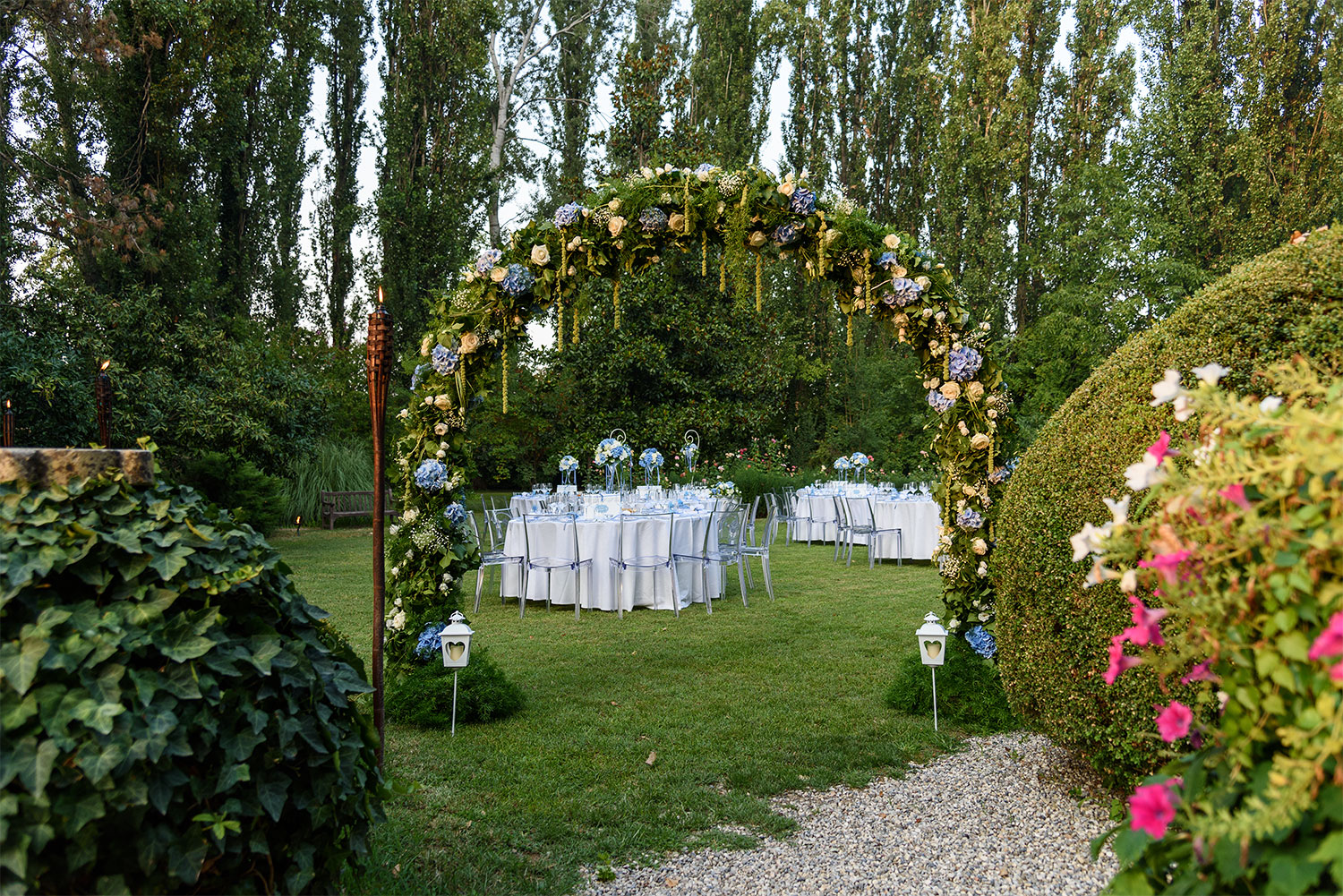 Il matrimonio di questa coppia doveva essere il più romantico possibile, i colori scelti erano il blu e il bianco. Per questo abbiamo impreziosito l’arco con addobbi floreali a tema e ai lati abbiamo posto due lanterne con motivo a cuore.