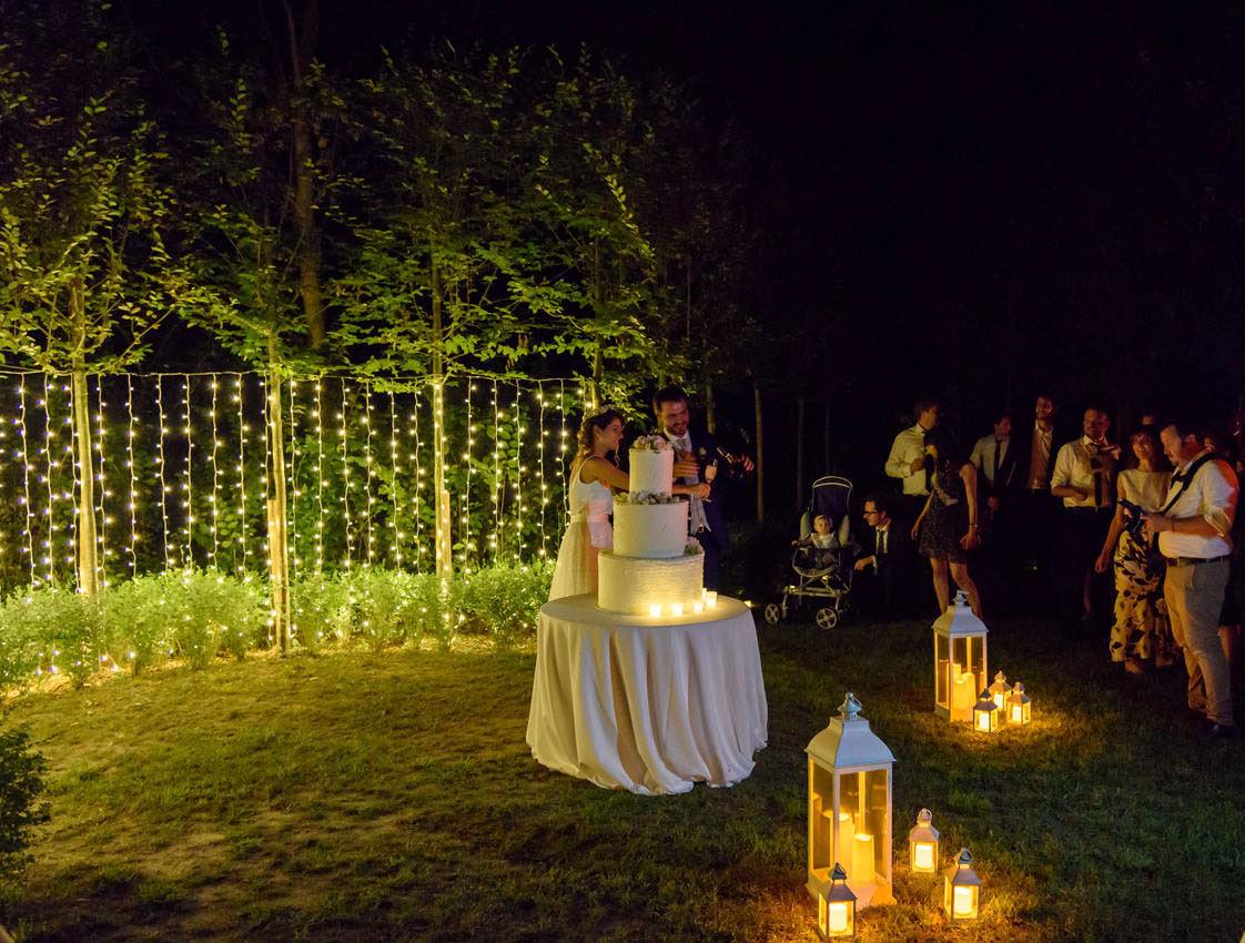 Abbiamo fissato delle tende di luci led prolungabili ai tronchi così da creare una parete luminosa. È diventata sfondo del taglio torta, uno dei momenti più emozionanti delle nozze.