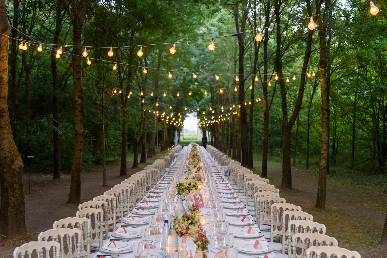 Le piante e soprattutto i tronchi sono però validi sostegni e noi abbiamo colto al volo l’occasione per appendervi a zig-zag delle catenarie di lampadine vintage a led. Creano atmosfera e producono una luce soffusa e molto delicata, ideale per un banchetto nuziale.