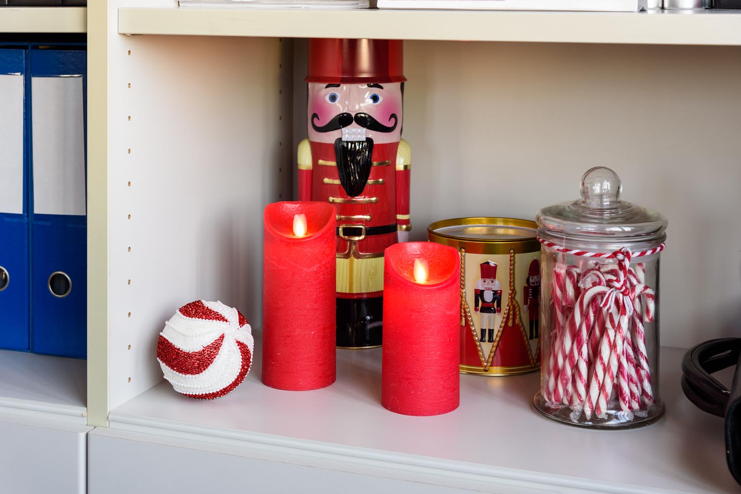 Passiamo ora alle superfici inutilizzate del nostro ufficio, come possono essere i davanzali delle finestre. Qui puoi sbizzarrirti e metterci sopra tutto quello che sulla scrivania risulta ingombrante. Decora il ripiano con un bel runner natalizio e usalo come base per poggiarci candele led e figure natalizie.