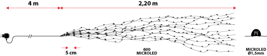 Questo fascio in metallo ha ben 600 micro led bianco caldo distribuiti su diversi fili metallici argentati da 2 m di lunghezza. Il riflesso di luce creato da questi piccolissimi bulbi led a forma di goccia sull'argento dei fasci produce un magnifico effetto luminoso.