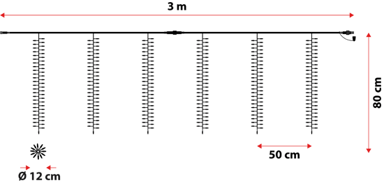 Questa cascata di luci professionale ha una larghezza di 3 metri ed è composta da 300 maxiled disposti su 6 calate di 0,8 metri di altezza. I led, distanti dal cavo, sono distribuiti a formare una specie di nastro alto 12 centimetri.