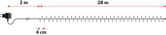 Su un cavo verde scuro lungo 28 metri si susseguono 700 led multicolor. L'effetto è assicurato perché il filo si mimetizza bene tra i rami e i led risaltano nell'oscurità. Applicabile sia all'interno che all'esterno, questa catena luminosa è ideale per ornare siepi e alberi del tuo giardino.