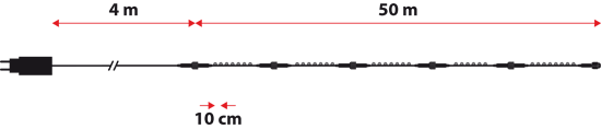 La catena misura 50 metri e si compone di segmenti da 10 metri l'uno. Ha un totale di 500 led a luce extra calda fissa.