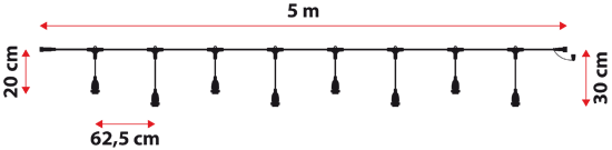 La catena ha robusti cavi in gomma di colore bianco (sezione del cavo di 2 x 1,5 mm2) con 8 portalampade E27 resistenti all'acqua (IP44) distribuiti sui 5 metri di lunghezza. I portalampade sono distanziati dal cavo principale per 20 e 30 cm, alternativamente.