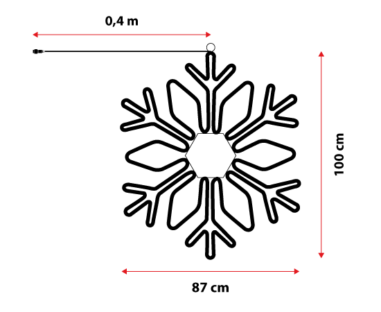 Questo Cristallo di Neve luminoso professionale di 87 x h. 100 centimetri è costruito con un tubo luminoso led bianco freddo che contorna la leggera ma robusta struttura di alluminio.