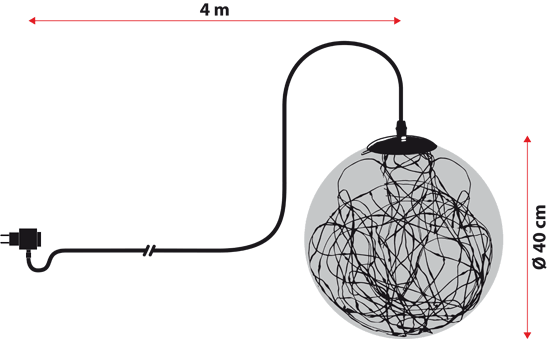 La decorazione è per uso interno e funziona in bassa tensione. Ha un cavo di alimentazione rinforzato di 4 metri, pensato apposta per la sospensione.