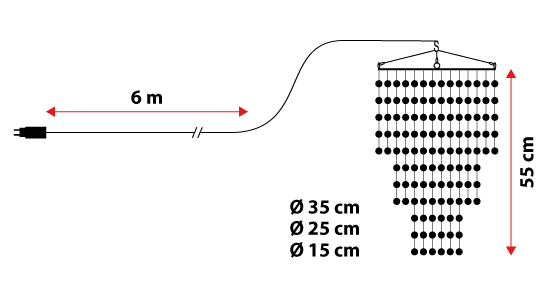 Questo lampadario a cascata 3D è un'elegante decorazione luminosa che catturerà l'attenzione di chiunque. Le dimensioni del lampadario sono: diametro 35 centimetri, altezza complessiva di 55 centimetri. È costituito da 3 cascate inserite una dentro l'altra, con misure rispettivamente di Ø 35 x h. 25 centimetri, Ø 25 x h. 40 centimetri e Ø 15 x h. 55 centimetri.