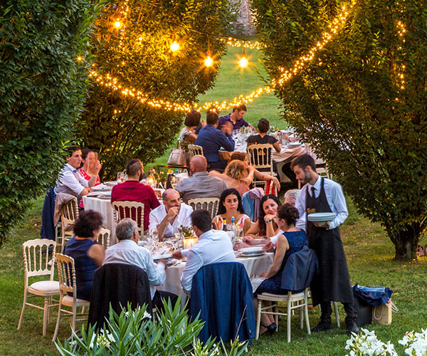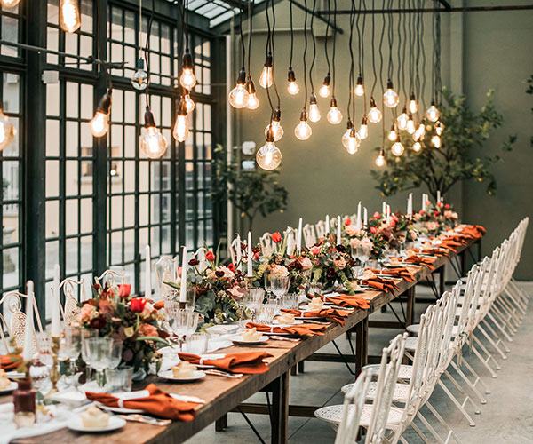 Un'unica tavolata o tanti piccoli tavoli? Come e dove posizionarli nella location? Poco importa, crea la giusta atmosfera e anima la festa con catene di luci. Sono tante e diverse le scenografie che puoi realizzare: un cielo stellato con catenarie di lampadine o una pioggia di luci che cadono come nastri dai rami di piante secolari.