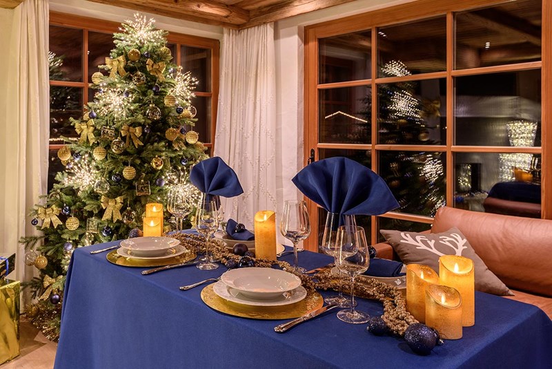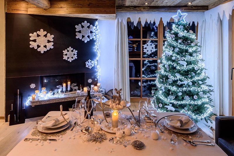 Tavola natalizia raffinata addobbata nei toni dell'argento, dell'oro e del bianco ghiaccio