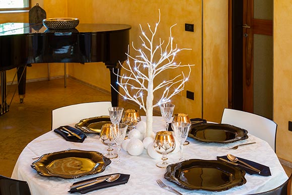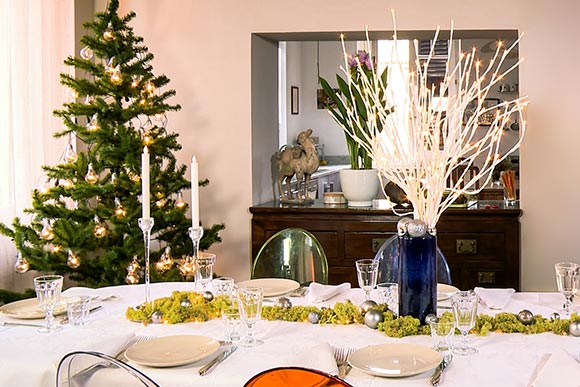 Tavola natalizia con albero led e palline bianche a centrotavola