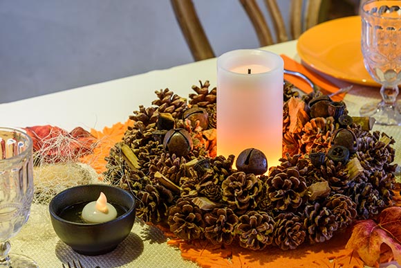 Corona di pigne illuminata da una candela led per un centrotavola naturale