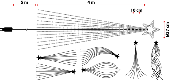 La decorazione è composta da una stella in metallo di 37 centimetri di diametro e una coda formata da 12 catene di 4 metri di lunghezza. E' possibile disporre le luci della coda in modi diversi, in questo modo l'effetto finale della decorazione sarà personalizzabile. Ad esempio la coda può essere disposta in modo classico su un lato della stella, in alternativa si può far scendere la coda verso il basso intrecciando le calate tra loro, oppure si possono distribure le calate a raggiera.