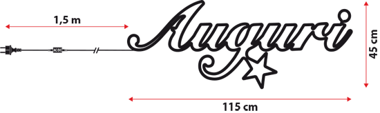 Un tubo led bianco caldo a luce fissa percorre il perimetro di un telaio in metallo bianco, che ricalca la scritta AUGURI e la forma di una stellina. Gli 840 led usati illuminano l'intero tubo, così da ricreare l'intenso effetto luminoso proprio dei tubi a neon.