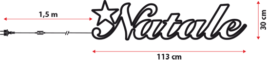 Un tubo led bianco caldo a luce fissa percorre il perimetro di un telaio in metallo bianco, che ricalca la scritta "NATALE" e la forma di una stellina. Gli 840 led usati illuminano l'intero tubo, così da ricreare l'intenso effetto luminoso proprio dei tubi a neon.