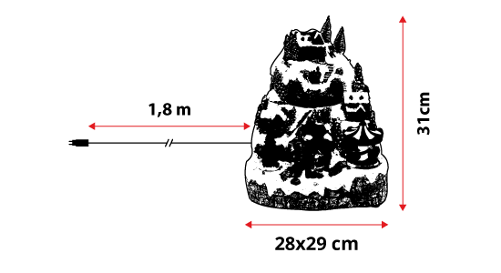 Funziona solo a corrente con il trasformatore incluso. L'interruttore, posto sul retro, può essere spostato su 3 diverse posizioni: acceso con musica, spento oppure acceso senza musica.